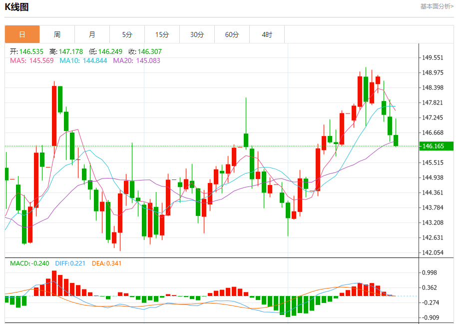 汇价高见147.197,低见146.096。上一交易日,汇价收于146.602。