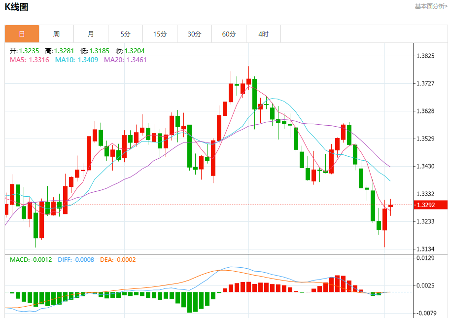 汇价高见1.3313,低见1.3253。上一交易日,汇价收于1.3282。