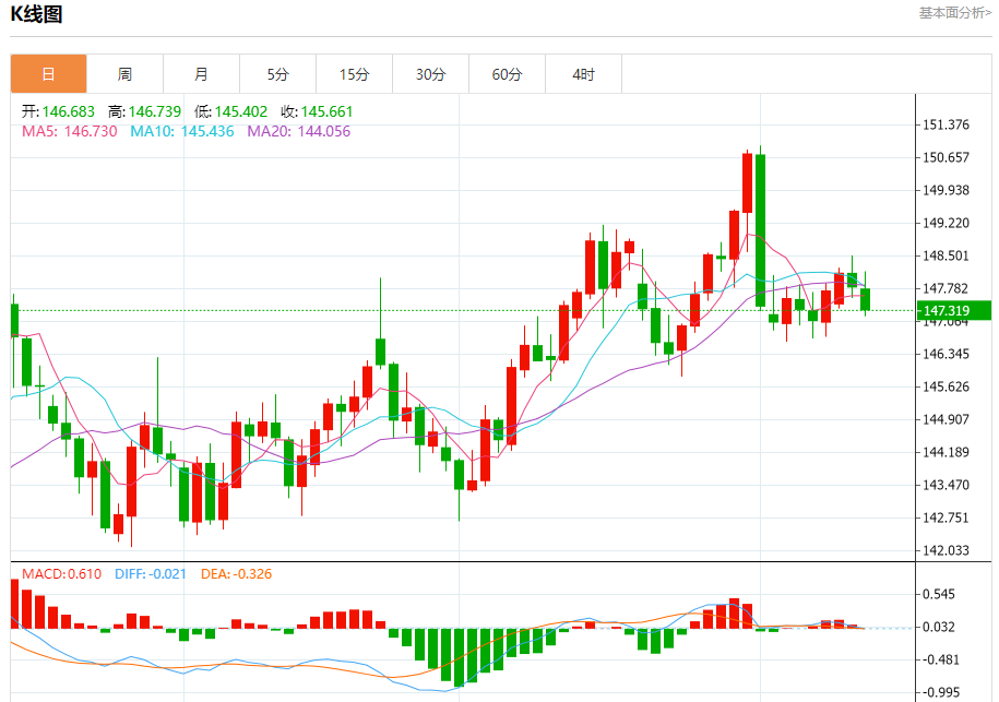 汇价高见148.155,低见147.166。上一交易日,汇价收于147.822。