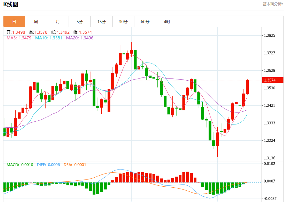 汇价高见1.3578,低见1.3492。上一交易日,汇价收于1.3498。
