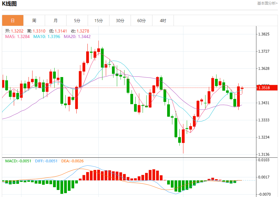 汇价高见1.3527,低见1.3483。上一交易日,汇价收于1.3526。