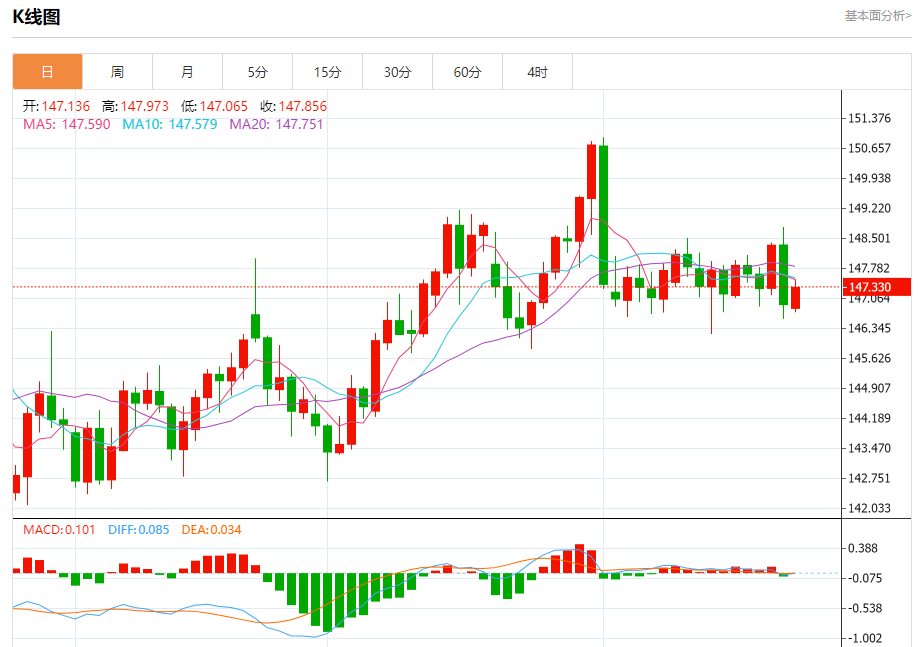 汇价高见147.514,低见146.723。上一交易日,汇价收于146.941。