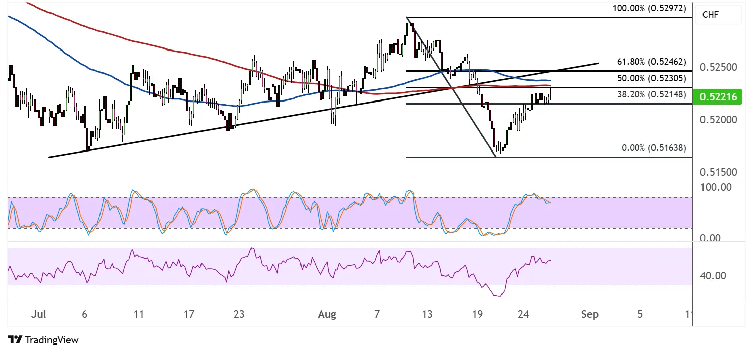 然而,价格似乎在斐波那契回撤位附近找到了一些稳定性,这可能为潜在的复苏奠定基础。38.2%回撤位位于0.52148,与当前价格走势密切相关,而50%水平位于0.52305。