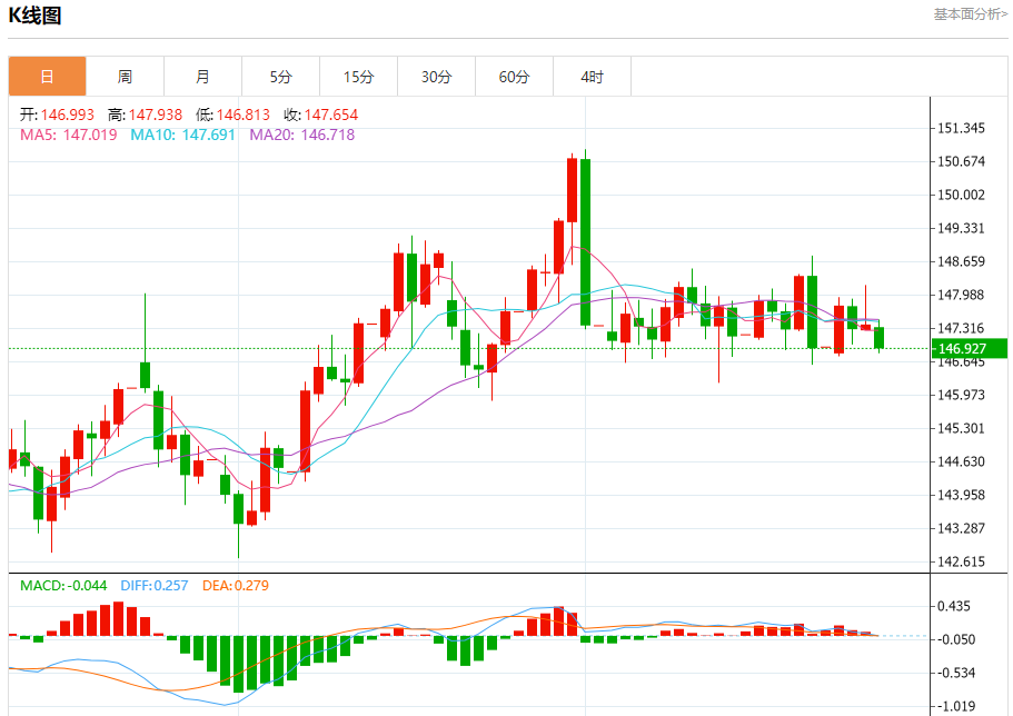 汇价高见147.487,低见146.806。上一交易日,汇价收于147.387。