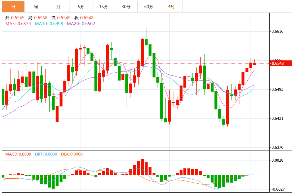 澳元/美元(AUD/USD)货币对在周二交易约为0.6550。 日线图的技术分析表明,该货币对交易在上升趋势线之上,增强了看涨偏向。 此外,该货币对位于九日指数移动平均线(EMA)之上,表明短期价格动能较强。