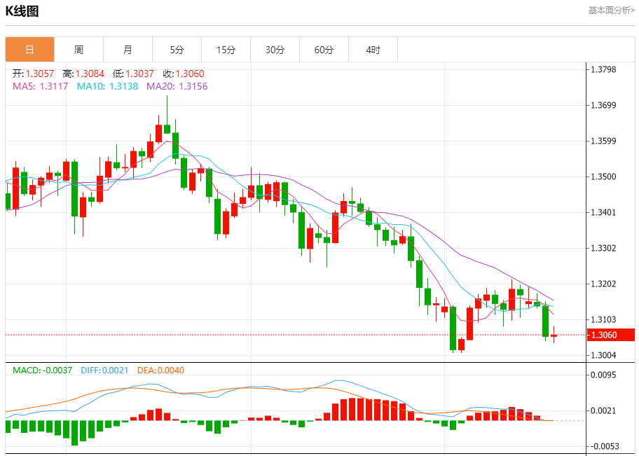 汇价高见1.3084,低见1.3037。上一交易日,汇价收于1.3058。