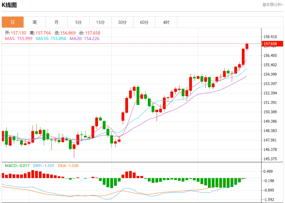汇价高见157.766,低见156.869。上一交易日,汇价收于157.133。