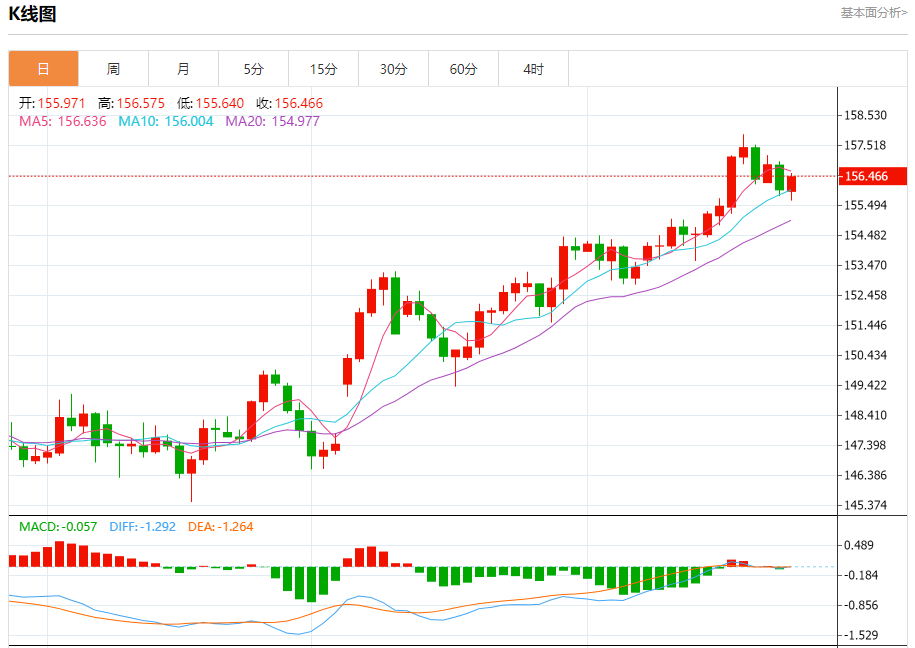 汇价高见156.584,低见155.652。上一交易日,汇价收于156.035。