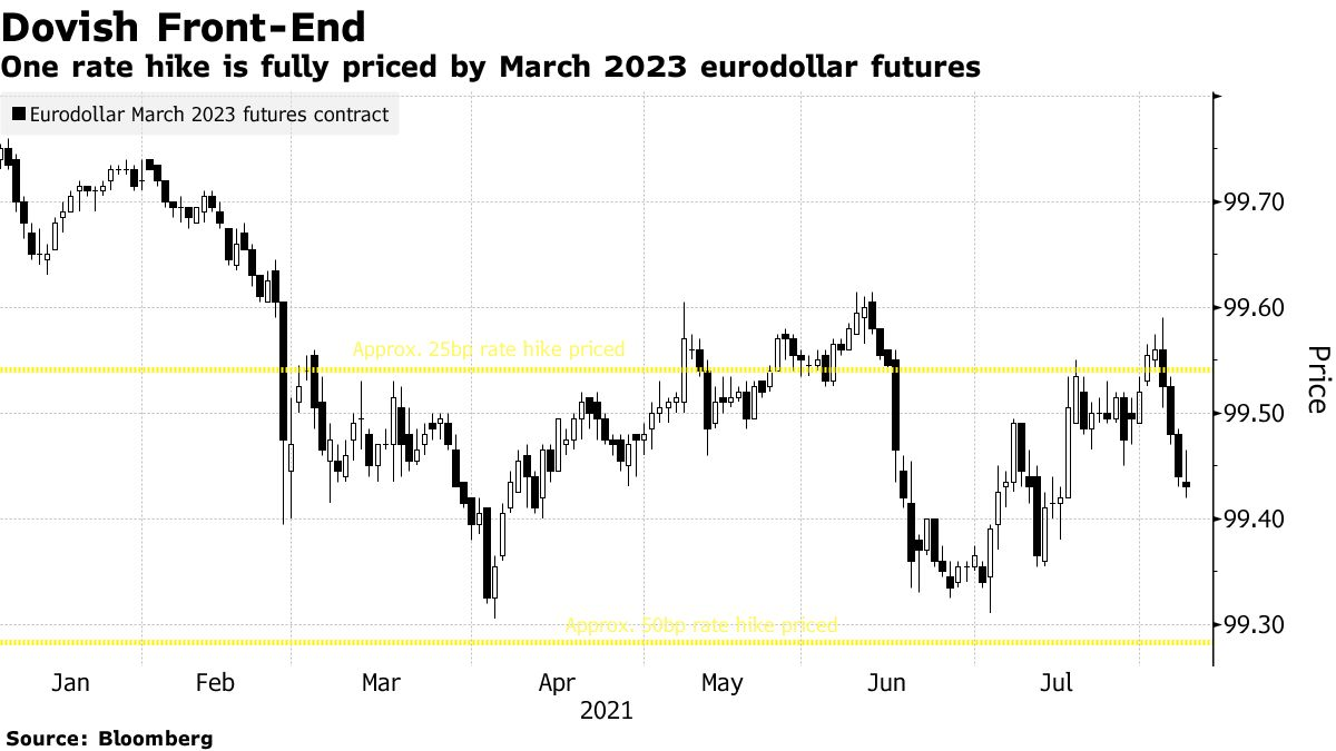 不过,虽然多名美联储官员本月先后谈到可能比预期更早撤出刺激措施,但债市猜测美联储官员只是口头转鹰。欧洲美元期货交易员仍继续押注美联储最早2023年开始加息25个基点。欧洲美元期权显示,不断出现对美联储2023和2024年将更激进加息的押注。
