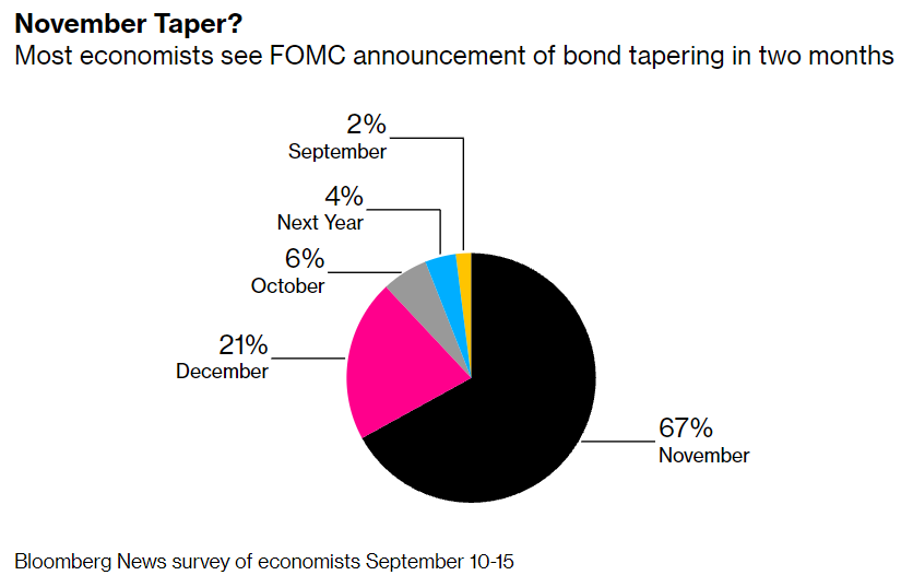 具体而言,67%的受访经济学家预计美联储将在11月的会议上宣布缩减购债计划,21%的经济学家预计购债规模将从12月开始缩减,预计9月行动的受访者占比只有2%。