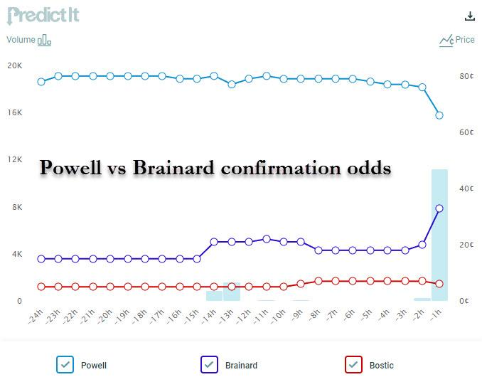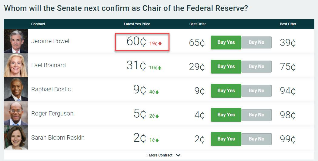毫无意外,鲍威尔的交易记录被披露后,他获得参议院连任提名的概率大跌。