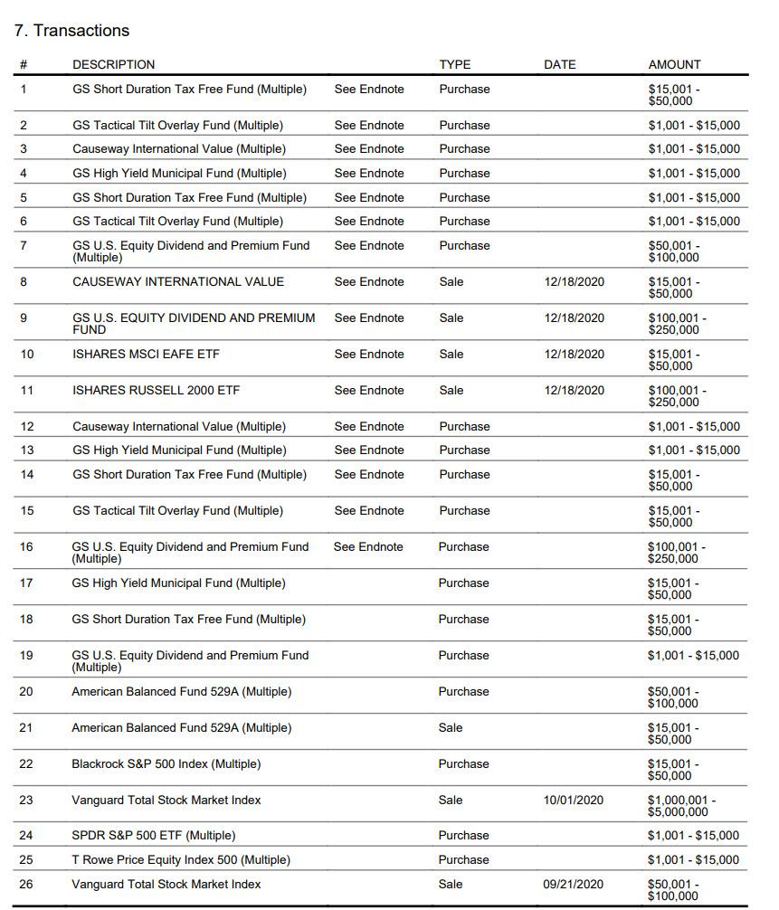 鲍威尔其余被曝光的交易也都是抛售。他在2020年9月21日(即美联储2020年9月15日至16日FOMC会议后几天)也抛售了5至10万美元的VTI ;12月18日(即12月16日FOMC会议后2天),进行了一系列金额在1.5万至25万美元的抛售,被抛售的包括MSCI EAFE ETF(EFA)、RUT罗素2000 ETF、高盛美国股票红利和溢价基金(GSPKX)等等。