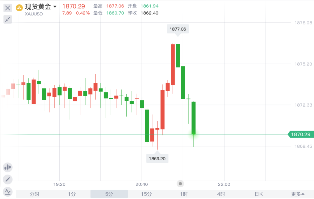 数据公布后,现货黄金短线走低2美元后,在1870关口获得了一定的支撑;美元短线走高后回落,美元兑日元刷新日高。