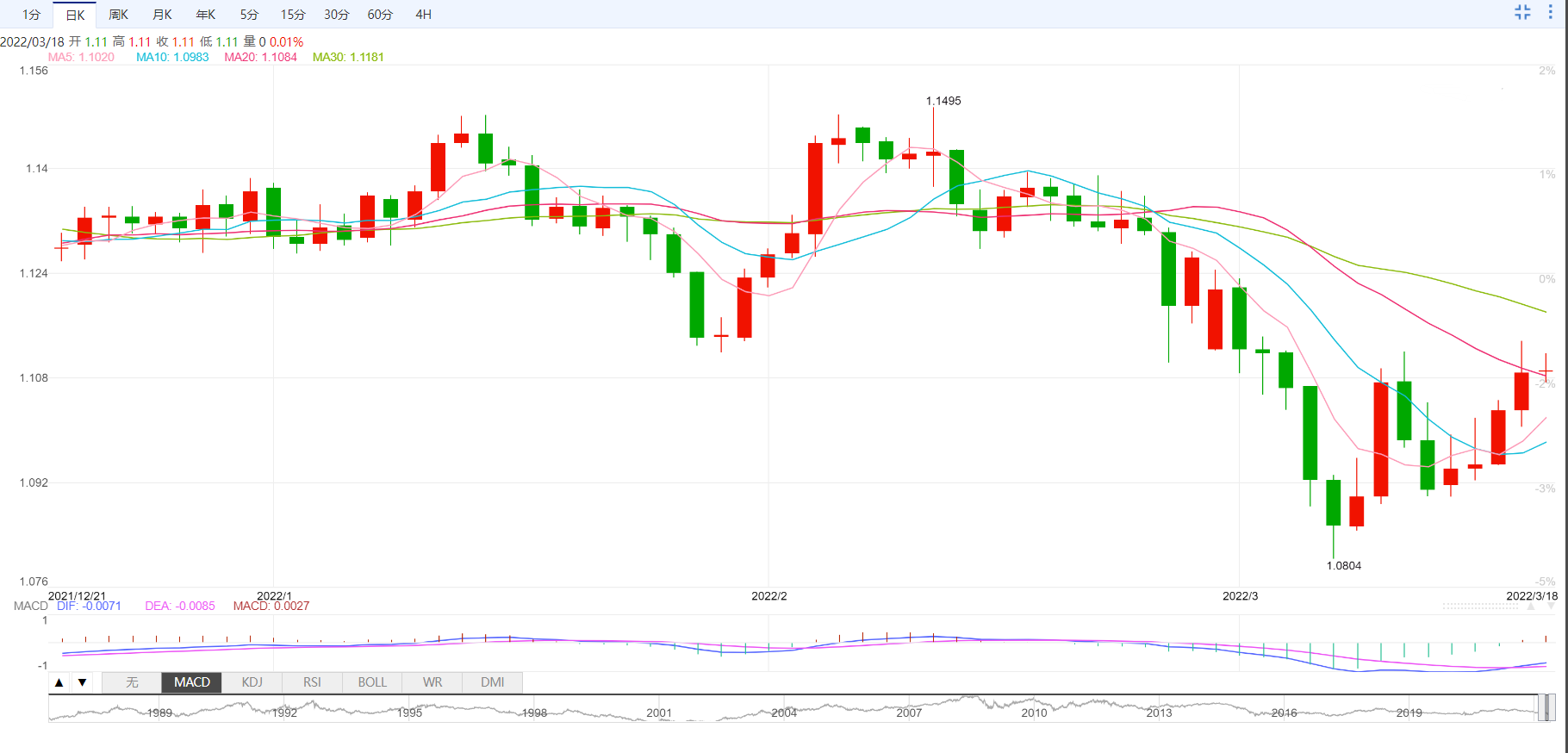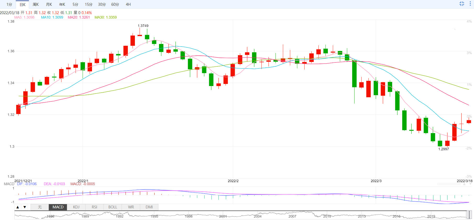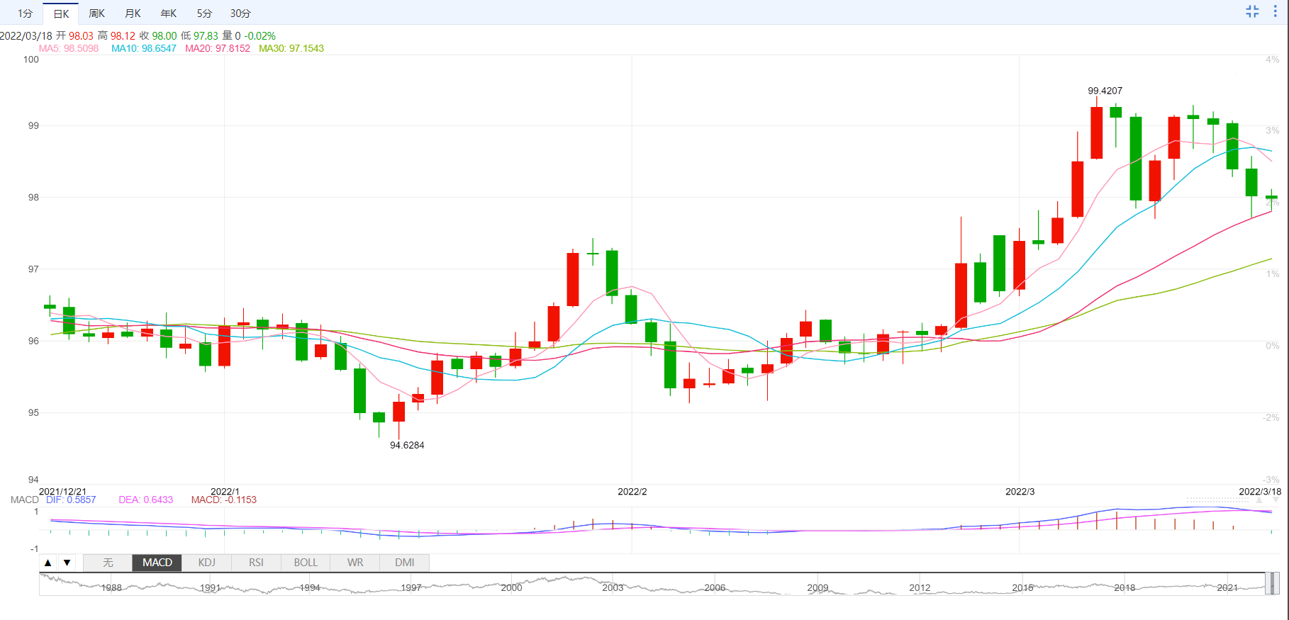 美元指数:截止发稿,美元指数走低,现报97.99附近,跌幅0.01%。欧市盘前,美元维持本周低位,并在周四触及98.20附近的多日低点。在美联储(fed)周三会议启动紧缩周期后,该指数进一步向南修正。来自地缘政治前景的乐观消息,以及风险相关综合体的良好基调可能令美元承压,所有这些都令美元指数面临额外压力。