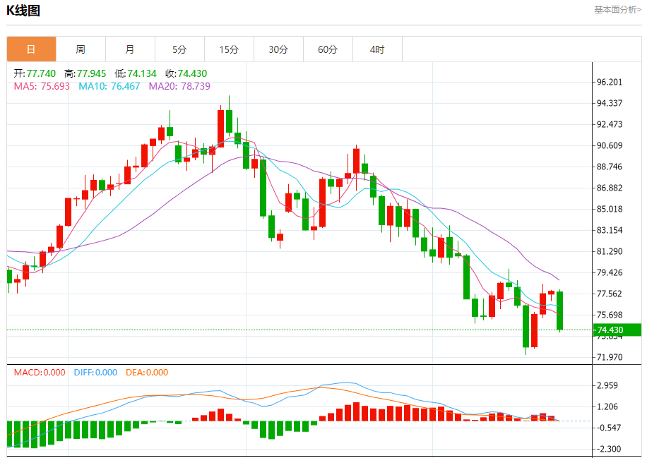 原油市场:截止北京时间21:16,美油下跌,现报74.386,跌幅4.47%。纽市盘前,原油价格面临攻击77.25水平的负面压力,这促使人们在即将到来的交易中保持谨慎,因为确认突破这一水平将停止最近暗示的积极情景,并迫使价格转向下跌,而价格需要超过77.86才能确认牛市趋势的延续,其下一个目标位于79.60,然后是81.20。