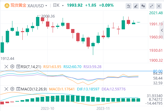 周五亚盘,黄金交投于1993.92附近。周五亚市早盘,金价收窄跌幅。周五美国没有经济数据公布,华尔街市场休市。美元指数小幅下跌至103.75。美国国债收益率整理跌势,10年期国债收益率为4.41%,利涨黄金,因为美国国债收益率是持有无收益金属的机会成本。