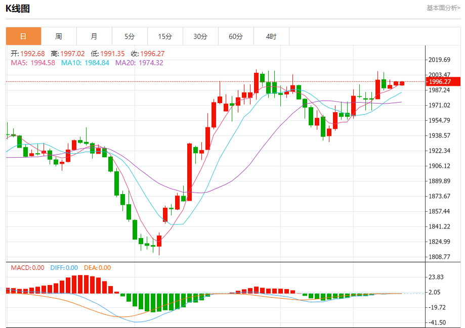 现货黄金:截止北京时间21:25,现货黄金上涨,现报1996.24,涨幅0.18%。纽市盘前,黄金价格显示出一些轻微的看涨倾向,试图离开看涨通道的支撑线,以保持今天的看涨趋势,由EMA50支撑,除了随机积极性,提醒你我们的下一个主要目标位于2009.30,而持有1990.00以上代表预期上涨的延续的关键条件。