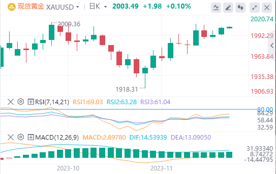 周五亚盘,黄金交投于2003.49附近。周一亚市早盘,金价维持在2000美元上方。11月初,美国私营部门的增长速度继续放缓。标普全球综合采购经理人指数(PMI)维持在50.7不变。同期,制造业采购经理人指数从50.0降至49.4,低于期值49.8。服务业采购经理人指数从前值50.6小幅上升至50.8,高于期值50.4。美联储不会进一步加息的预期推动金价涨势。与此同时,美元指数跌至9月份以来的最低水平103.40。也就是说,美元走软还是提振了以美元计价的黄金。