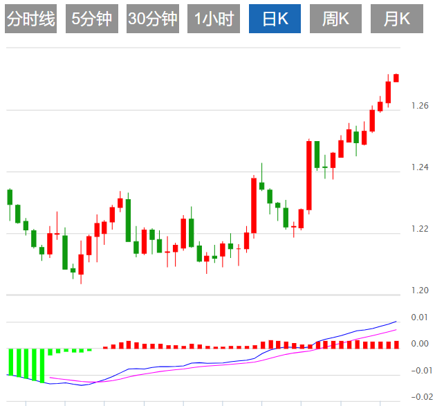 英镑:截止发稿,英镑/美元上涨,现报1.2716,涨幅0.17%。欧市盘前,英镑/美元连续第五天走高,这也是前九天上涨的第八天,并在周三亚洲时段升至三个月新高。现货价格目前在1.2715-1.2720区域附近交易。周三,英国将公布任何影响市场的宏观数据,而美国经济报告则公布了第三季度GDP增长数据的初步或第二次估计。这与美国债券收益率一起,将影响美元价格动态,并为英镑/美元货币对提供一些动力。