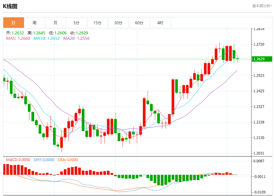 英镑/美元:截止北京时间21:24,英镑/美元下跌,现报1.2630,跌幅0.02%。纽市盘前,GBPUSD对在EMA50附近波动,它保持稳定在1.2590水平以上,保持今天的看涨趋势情景有效,受到现在明显出现的随机乐观的支持,等待访问1.2720水平作为下一个主站,提醒你突破1.2590将使趋势转向下行,最初走向1.2460水平。
