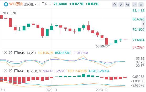 周二亚盘,原油交投于71.60附近。尽管欧佩克+承诺在2024年第一季度减产220万桶/日,但投资者仍对这是否会导致供应大幅下降持怀疑态度。对非欧佩克国家产量增长的预期引发了人们对未来一年供应过剩的担忧。此外,对主要石油进口国中国通货紧缩的担忧,以及消费者价格指数(CPI)和生产者价格指数(PPI)未达到预期,增加了原油价格的下行压力。最近的数据显示,中国11月的石油进口降至四个月来的最低水平,反映出高库存和疲软的燃料需求。