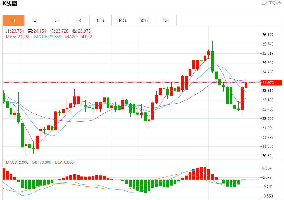 现货白银:截止北京时间21:27,现货白银上涨,现报23.960,涨幅0.76%。纽市盘前,白银价格显示出额外的积极交易,以远离23.70水平,加强了对今天剩余时间继续看涨趋势的预期,并且实现我们主要等待目标24.60的道路是开放的,注意,突破23.70将停止建议的牛市,并推动价格转向下跌。