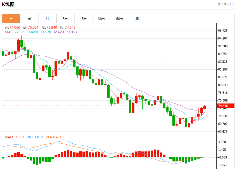 原油市场:截止北京时间21:20,美油上涨,现报74.875,涨幅0.96%。纽市盘前,原油价格积极交易,突破73.73水平,并试图保持在此之上,暗示在即将到来的交易中建立牛市,并实现从75.90开始并延伸到77.86的收益,使今天剩余时间的看涨偏差,受到EMA50上方的支撑。