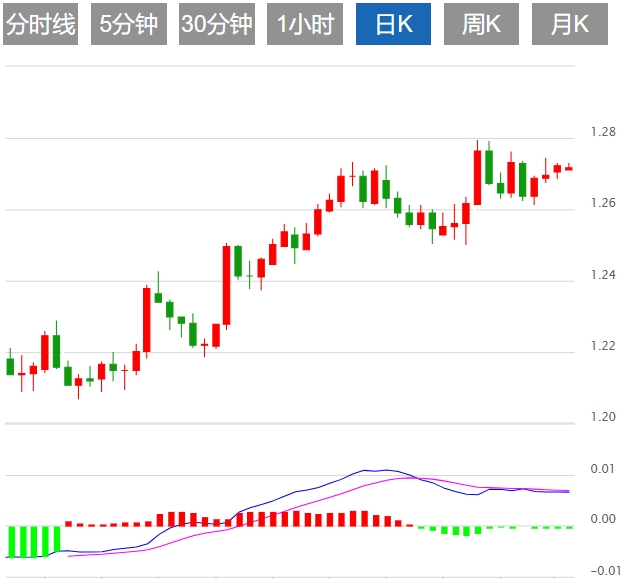 技术面:继续在1.26-1.28的即时区间内交易,试图向1.28的上端移动。