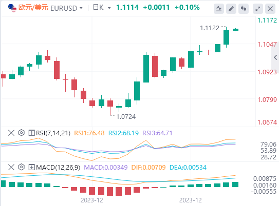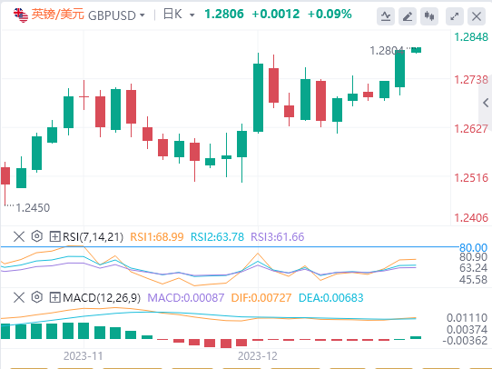 英镑:截止发稿,英镑/美元徘徊于1.2806附近。昨日英镑/美元上涨,收报1.2801,涨幅0.56%。英镑兑美元周三攀升,原因是市场风险偏好推动美元下跌,从而提振了英镑。由于投资人倾向于押注美联储将进入更大规模的降息周期,许多市场参与者押注美联储最快将在3月开始降息,因此整个市场风险偏好持续飙升。技术上,英镑兑美元继续在美元疲软而非英镑走强的背景下走高,从10月底部1.2040附近攀升愈6%。200日均线处在1.2525构成长线技术支撑,英镑/美元多头或美元空头面临的下一个直接挑战将是推动英镑/美元重返1.3000主要关口。