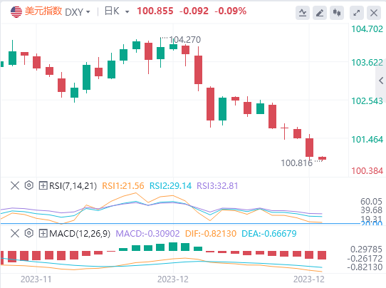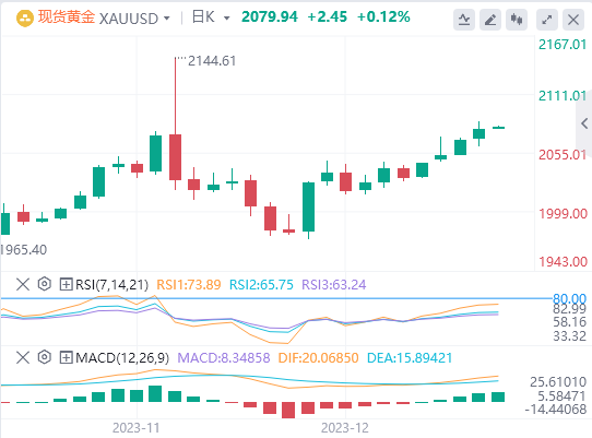 周四亚盘,黄金交投于2079.94附近。周三的交易中,金价跳涨至2,070美元,涨幅为0.50%。这主要是由于市场对美联储(Fed)鸽派押注的猜测不断升温,加上美债收益率似乎停留在数月低点,这有利于黄金的上涨。随着11月美国PCE价格指数出现大幅下降,市场对美联储可能在明年初首次降息的乐观情绪日益高涨。此前,消费者物价指数(CPI)连续下降,美联储官员预测2024年将降息75个基点,这也给美元和美债收益率带来压力。芝加哥商品交易所美联储观察工具显示,,市场押注1月份降息的几率为15%,并将于3月至5月期间降息50个基点。