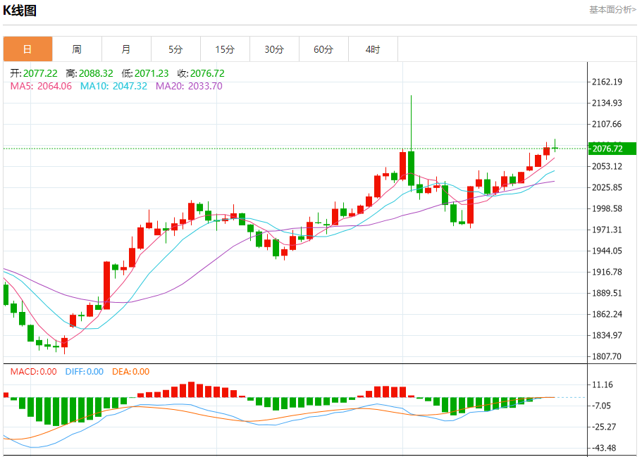 现货黄金:截止北京时间21:20,现货黄金下跌,现报2077.08,跌幅0.02%。纽市盘前,黄金价格下跌至主要看涨通道的支撑线,可能会测试关键支撑位2065.70,然后再次回升。