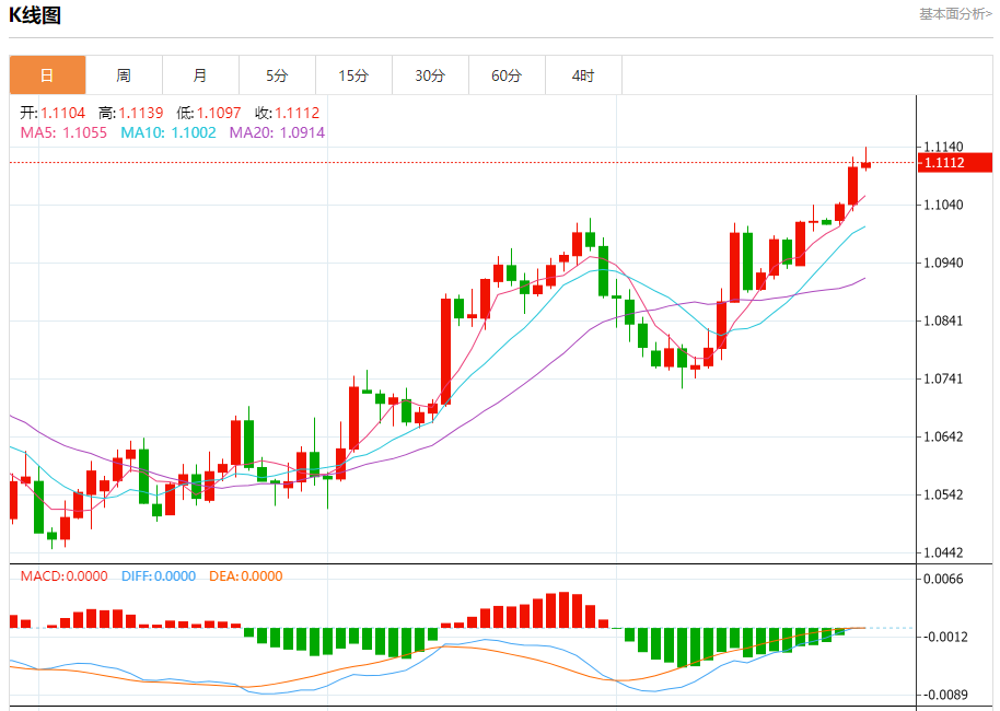 欧元/美元:截止北京时间21:20,欧元/美元上涨,现报1.1113,涨幅0.06%。纽市盘前,欧元对美元稳定在1.1100水平附近,等待聚集积极的动力,帮助推动价格恢复今天预期的看涨趋势,目标是1.1145,随后是1.1200,作为下一个主要站。