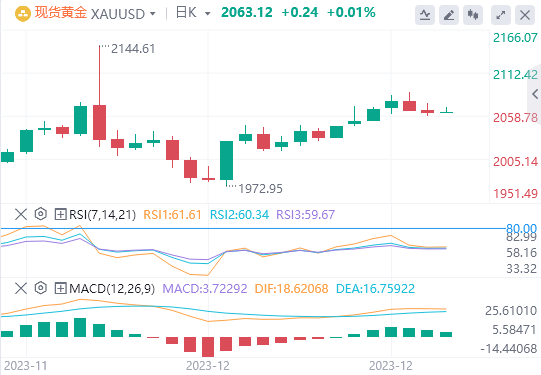周二亚盘,黄金交投于2063.12附近。周二亚市黄金开盘上涨。美元疲弱以及中国经济刺激措施积极为黄金上扬提供了支撑。,市场维持美国经济可能进入衰退的巨大预期以及美联储(Fed)可能降息的预期对美元汇率构成了压力,并提振以美元计价的大宗商品。投资者将密切关注周五公布的12月就业数据,包括美国非农业数据。预计12月非农业就业人数将增加16.3万,而11月为19.9万。失业率预计将攀升至3.8%,而12月平均时薪月率预计将增加0.3%。如果非农业数据弱於预期,可能会对美元造成一定的抛售压力。