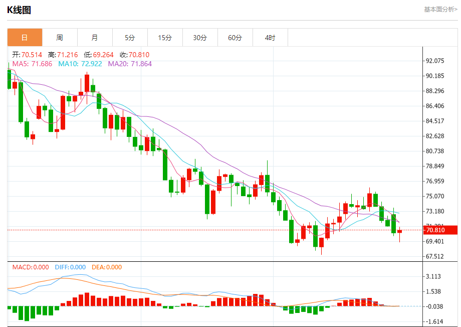 原油市场:截止北京时间21:20,美油上涨,现报70.834,涨幅0.51%。纽市盘前,原油价格显示新的负面交易开始远离熊市通道的阻力,以支持今天预期的熊市趋势的延续,由EMA50形成的负面压力加强,提醒你我们的下一个主要目标达到67.04区域,而实现它需要持有低于71.10。