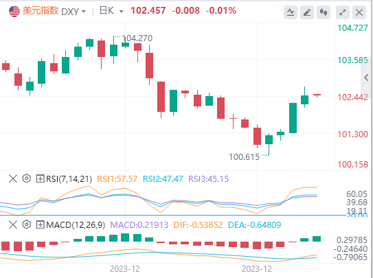 美元指数:截止发稿,美元指数交投于102.457附近。美联储在上一次2023年会议上的鸽派立场,欢迎通胀降温,并驳回2024年的加息,受到了上一交易日抛售美元的市场的积极欢迎。然而,尽管投资者预计2023年3月和5月降息的可能性很高,但即将到来的数据可能会改变这些预期,并将重点转移到12月的劳工报告上。技术面上,RSI位于正区域和正斜率,表明美元的购买势头正在增强,表明买家可能会继续推高货币指数价格。MACD的绿条不断上升,这表明它向牛市区域转变。然而,正如SMA所示,情况并不完全乐观。该指数在20天SMA上方的位置突显了短期购买势头,但在100天和200天SMA下方的位置提醒我们,在更广泛的时间范围内,持续的抛售力量将继续占主导地位。这表明一股看跌的暗流可能需要获得更多的动力,然后情况才会有利于卖家。