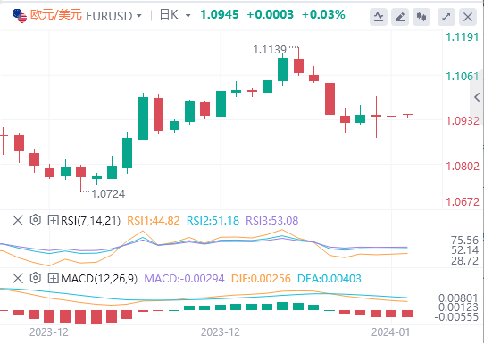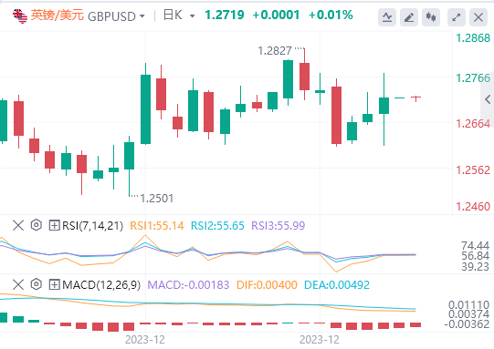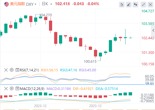 美元指数:截止发稿,美元指数交投于102.418附近。全球市场惨遭2024年“开门黑”,央行降息狂欢派对戛然而止,交易员重新定价降息押注,美联储会议纪要以及周五非农就业报告更是为此“添一把火”。技术面上,RSI在负值区域呈负斜率,表明DXY普遍存在看跌趋势。抛售势头似乎更为强劲,反映了RSI的下行趋势。MACD显示出上升的红条,这意味着负面势头正在逐渐升级,进一步强化了看跌前景。SMA在20天SMA附近徘徊,仍低于长期100和200天SMA。这表明,在更广泛的背景下,卖家可以轻松掌控局面。
