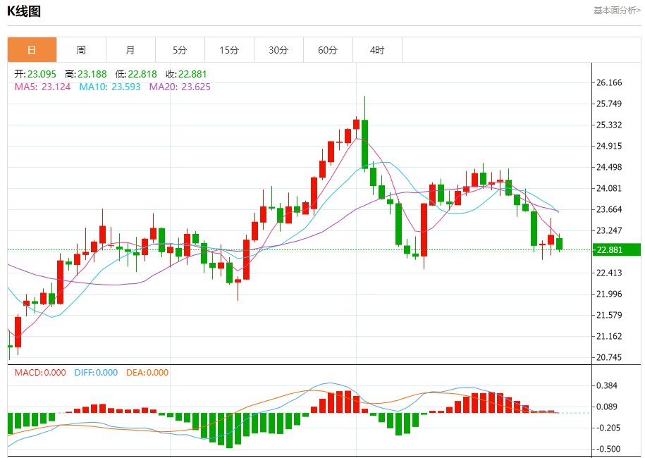 现货白银:截止北京时间21:20,现货白银下跌,现报22.891,跌幅1.16%。纽市盘前,银价试图突破23.00水平,加强了在即将到来的交易中继续看跌趋势的预期,受先前完成的头肩顶形态的影响,提醒您我们的下一个主要目标位于22.25,而实现它需要确认突破23.00并在其下方盘整。