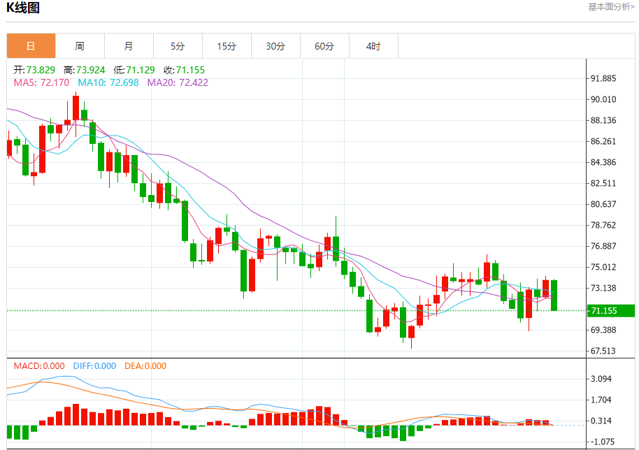 原油市场:截止北京时间21:20,美油下跌,现报71.159,跌幅3.64%。纽市盘前,原油价格在EMA50附近徘徊,自上午以来没有表现出任何强劲的走势,因此,我们的中立仍然有效,因为我们正在等待突破72.40支撑或突破73.73,以明确检测下一个目的地。