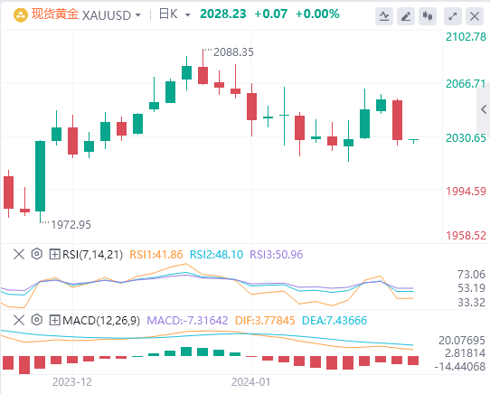 周三亚盘,黄金交投于2028.23附近。黄金价格仍面临压力。持续的美元需求和美国国债收益率上升拖累黄金走低。美元指数上行空间扩大至年初至今的新高,突破103.30关口。美国国债收益率小幅走高,10年期国债收益率为4.05%。美联储理事克里斯托弗·沃勒(Christopher Waller)周二表示,美联储今年将能够降低联邦基金利率的目标区间。沃勒补充说,当开始降息的时机成熟时,应该有条不紊地谨慎地降低利率。根据CME FedWatch工具,市场预计FOMC将在3月份开始降息的可能性为67%。然而,交易员进一步将2024年的预期提高到7次降息,但在沃勒发表评论后将其恢复到6次。
