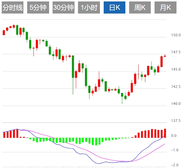 日线图上,美元/日元隔夜终于冲破了近期的上方阻力146.00,各项技术指标明显转为上扬,显示美元有加速回升的趋向。上方前进的目标将瞄向148,进一步有望测试150水平。此此前的强阻力水平146将转为初步的支撑位。