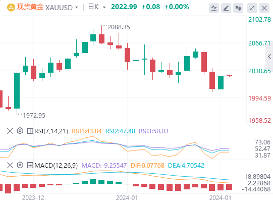 周五亚盘,黄金交投于2022.99附近。黄金早盘收复了一些失地。随着美元复苏停滞,黄金反弹。与此同时,美元指数徘徊在103.40附近。美国国债收益率巩固涨幅,10年期国债收益率为4.14%。美国经济数据坚韧,美联储的鸽派立场削弱了对提前降息的预期。美联储官员并不倾向于支持提前降息,尽管3月份降息的可能性仍在57%左右。