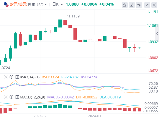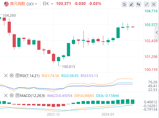 美元指数:截止发稿,美元指数交投于103.371附近。美元情绪乐观,强劲的住房和劳动力数据以及负面的市场情绪提振了涨幅。中东的紧张局势和中国股市的疲软似乎正在推动对美元的需求。技术面上,日线图中的技术形势反映了看涨和看跌势头之间的混合立场。RSI的正斜率和正区域位置表明买入势头正在逐渐建立。这表明随着时间的推移,市场参与者变得更加看涨。