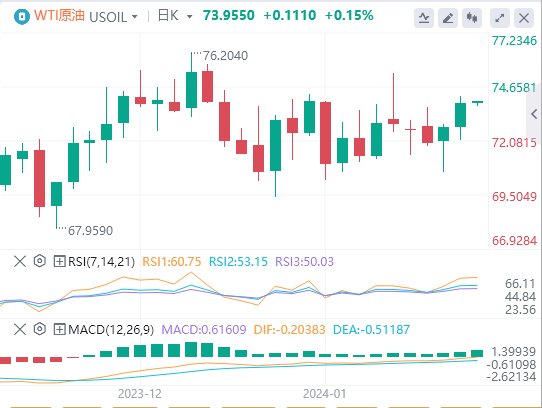 周五亚盘,原油交投于73.95附近。美国能源信息署(EIA)的原油数量显示,美国原油(WTI)周四攀升至每桶74.00美元,此前美国原油供应的跌幅超过市场预期。伊朗支持的胡塞叛乱分子发誓要加强对通过红海的民用货船的袭击,此前美英联军对也门胡塞控制的导弹发射场的海军打击有所增加。