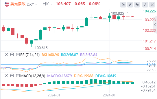 美元指数:截止发稿,美元指数交投于103.407附近。美元指数周一飙升,报103.75,涨幅创下12月中旬以来的最高水平。这一飙升是在预计是多事之秋之前,美联储(Fed)将于周三公布2024年的首次决定,周五将公布美国的关键劳动力市场数据。技术面上,日线图上的指标反映了买盘势头的复苏。RSI正区域的正斜率表明多头正在获得更大的力量。这种反弹也可以在MACD的上升绿色条中观察到,暗示了更大的看涨影响。该指数位于20天SMA上方,显示直接市场趋势有利于买家。然而,低于100日均线的位置表明中期看跌偏见。但一个重要的发展是高于长期200日均线的位置,这表明主导趋势仍然看涨。因此,目前的技术环境表明,虽然空头暂时控制了局面,但美元买家目前正处于夺回主导地位的跑道上。整体趋势似乎仍倾向于看涨。