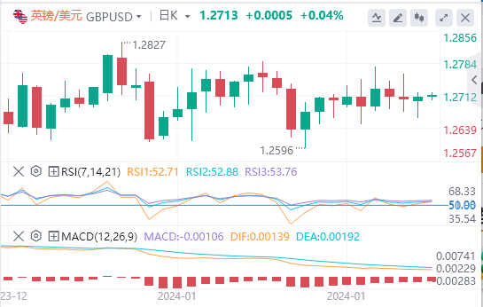 英镑:截止发稿,英镑/美元徘徊于1.2713附近。上周五英镑/美元下跌,收报1.2709,涨幅0.05%。市场普遍预计英国央行将维持利率稳定。交易员将密切关注利率指引和有关未来降息可能性的信息。英国央行行长安德鲁·贝利(Andrew Bailey)表示,现在降息还为时过早。然而,通胀危机正在缓解的迹象可能会说服央行降低利率。技术面上,英镑/美元在1.2625至1.2800区间内波动不大。该货币对继续盘整,交易者将继续等待该货币对收于该区域之外,以确认下一步走势的方向。趋势仍然看涨,因此200日移动平均线的下跌可能是交易者增加多头头寸的机会。
