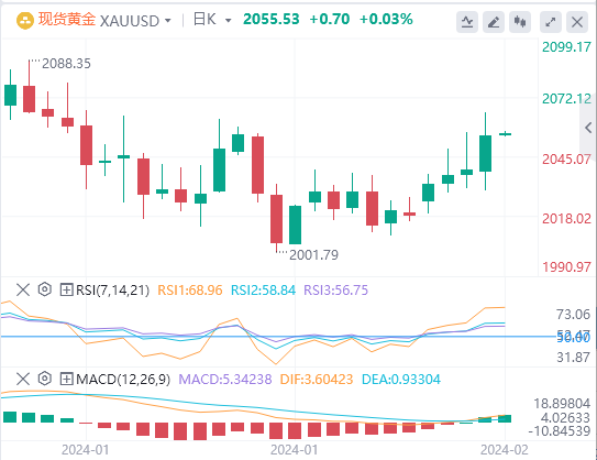 周五亚盘,黄金交投于2055.53附近。美联储主席鲍威尔认为,美联储不可能在3月份达到开始宽松政策的信心水平。作为反应,美元在周三反弹,因为市场开始放弃更快减息的预期,但即将公布的数据将最终指导美联储确定宽松周期的时间。如果周五的劳动力市场数据疲软,黄金可能会进一步上行,因为降息预期往往有利于非收益资产。