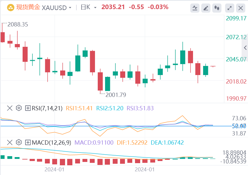 周三亚盘,黄金交投于2035.21附近。现货黄金窄幅震荡目前交投于2035美元/盎司附近。金价周二上涨0.5%,收报2035.78美元/盎司,收复了周一的部分跌幅,因此前美元和美债收益率回落,给金价提供反弹机会,交易商等待本周几位美联储官员的讲话,以判断今年可能的降息步伐。