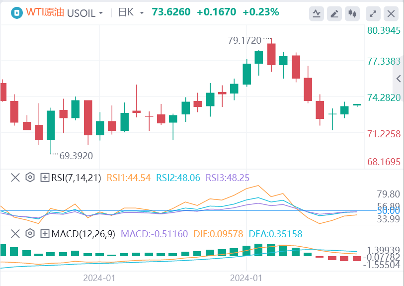 周三亚盘,原油交投于73.62附近。美元的回调和美国国债收益率的下降为石油市场提供了支撑。美国能源部透露,2024年原油日产量将增加17万桶,低于市场预测的29万桶。与此同时,以色列与哈马斯冲突的缓和将令石油交易商松一口气,并可能推动油价走低。周二,美国国务卿安东尼-布林肯表示,哈马斯已对以色列提出的停火建议做出答复,称将在未来几小时内对其进行研究。