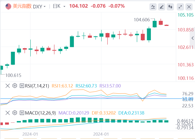 美元指数:截止发稿,美元指数交投于104.102附近。由于投资者兑现利润以及克利夫兰联邦储备银行行长洛雷塔·梅斯特(LorettaMester)声明的影响,美元指数一直处于下跌趋势。梅斯特警告说,在紧缩货币政策方面做得太多的风险,以及它如何影响劳动力市场。本周,其他几位美联储官员将出席会议,他们可能会决定美元的步伐,因为市场正在等待新的经济报告。技术面上,日线图上的指标反映了向卖方移动势头的短期转变,但长期趋势似乎仍然有利于多头。尽管斜率为负,但相对强弱指数(RSI)仍保持在正区域,表明回调或盘整期,而不是重大趋势逆转。