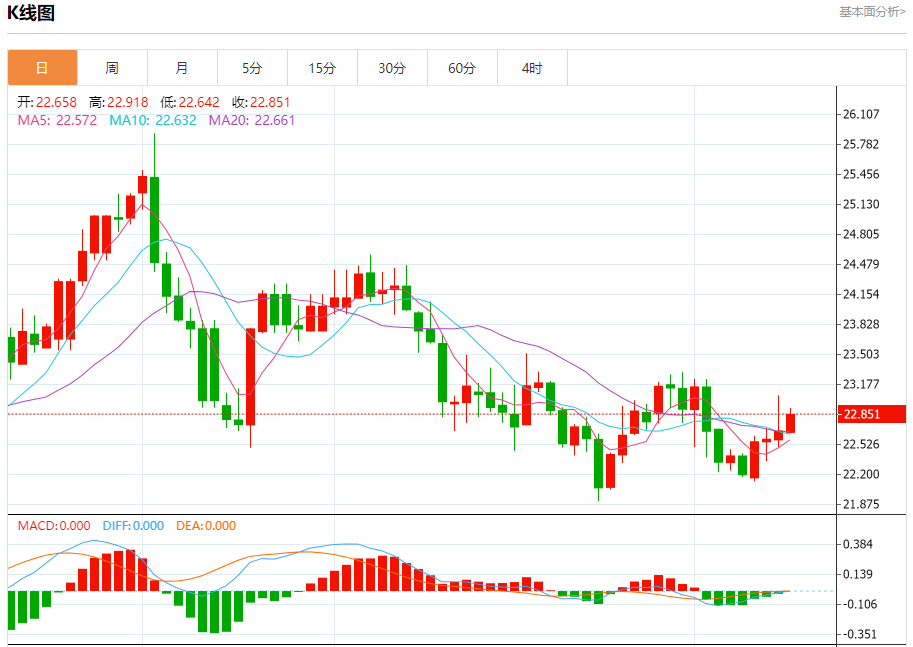 现货白银:截止北京时间21:15,现货白银上涨,现报22.851,涨幅0.81%。纽市盘前,白银价格恢复积极交易,达到23.00水平的阈值,随机指标开始积极重叠,以支持突破这一水平的机会,并为向我们的下一个目标23.70延伸看涨波开辟道路,以保持积极的情况有效,并以价格稳定在22.25以上为条件。